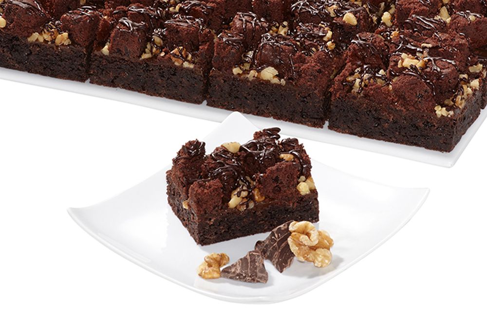 Leckere Brownie-Würfel, knackige Walnüsse und Karamell-Creme auf einem köstlich, saftigen Schokoladen-Rührteig mit dunklen Kringeln dekoriert.