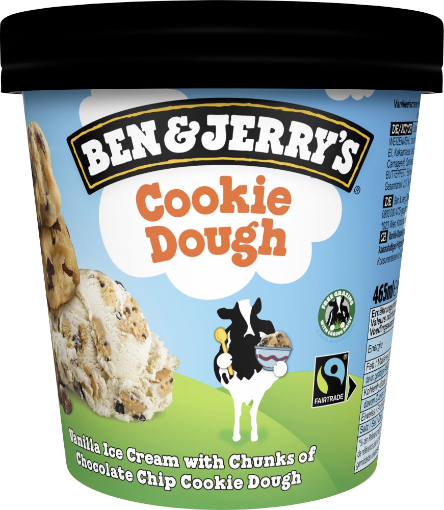 Vanille-Eiscreme mit riesen Cookieteig-Stücken und leckeren kakaohaltigen Bits.