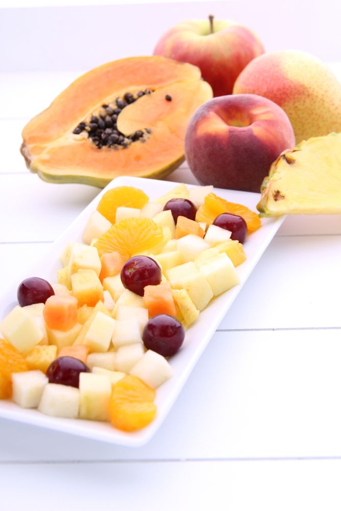 Mischung aus: Äpfel, Weintrauben, Pfirsiche, Birnen, Papaya, Ananas, Mandarinen
