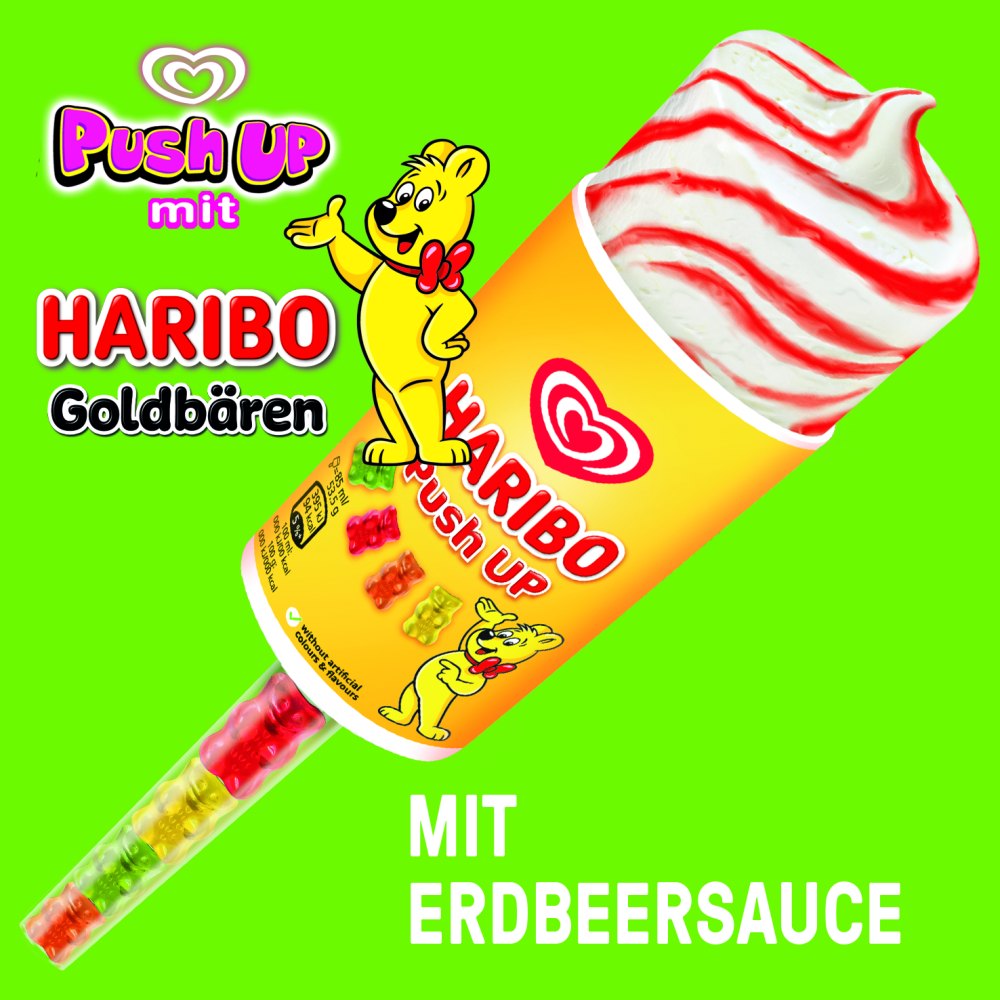 Eis mit Vanillegeschmack und Erdbeersauce und Fruchtgummibärchen.