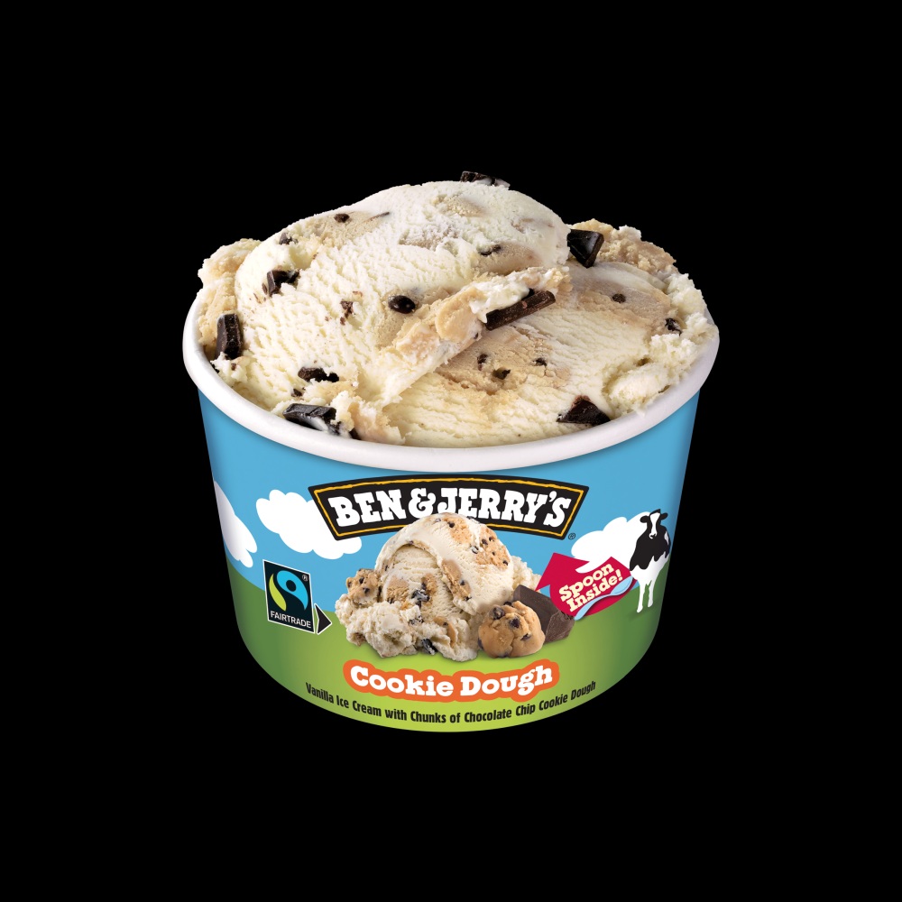 Vanille-Eiscreme mit riesen Cookieteig-Stücken und leckeren kakaohaltigen Bits.