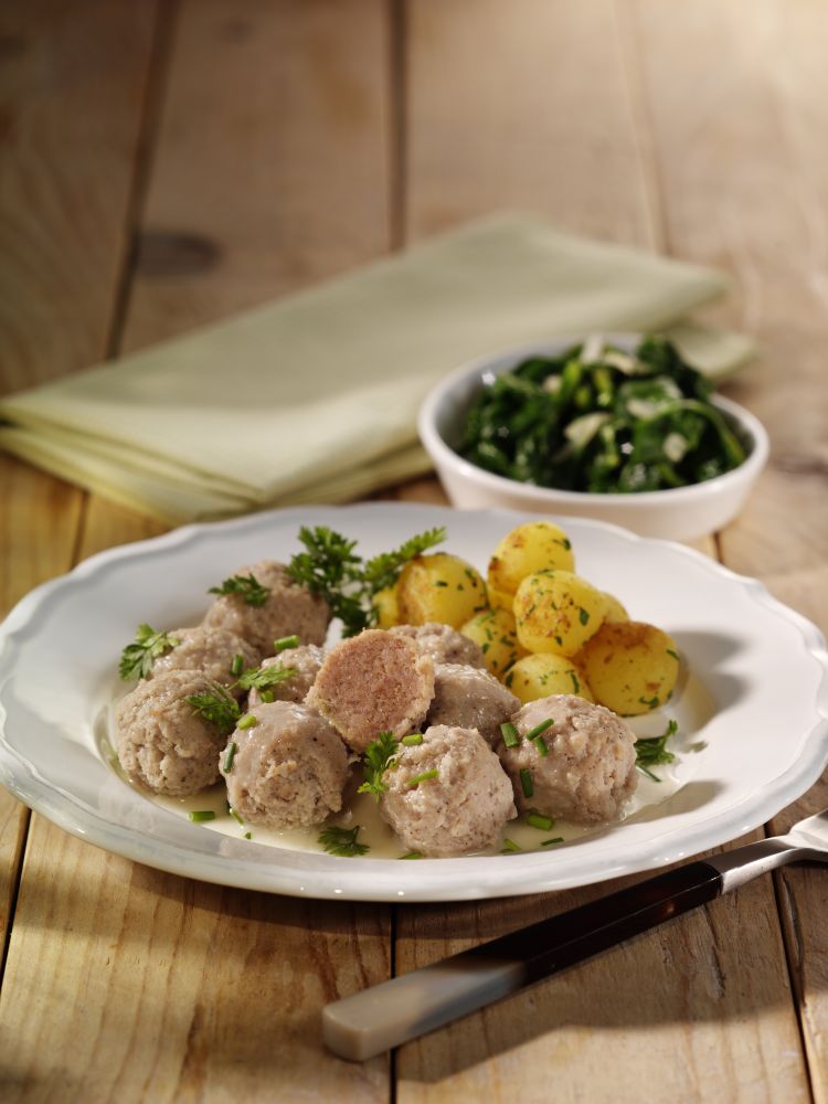 Mild gewürzte Suppenklößchen aus fein zerkleinertem Schweinefleisch zusammengefügt.