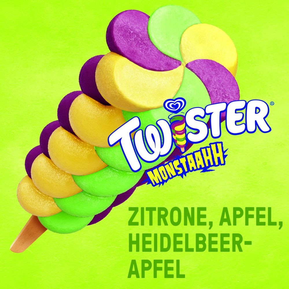 Aufregend verdrehtes Wassereis mit Zitronen-, Apfel- und Heidelbeergeschmack.
