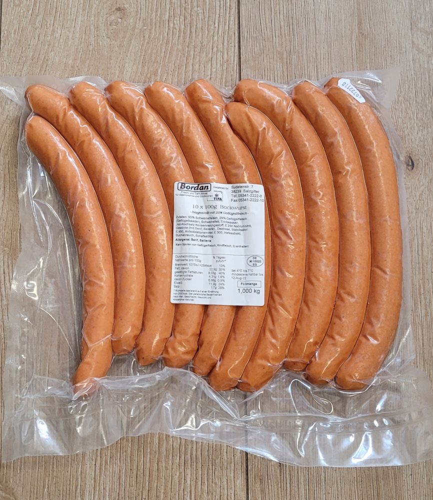 Ein Klassiker der deutschen Küche – unsere saftige Bockwurst aus hochwertigem Fleisch. Perfekt für ein herzhaftes Mittagessen oder als Snack.