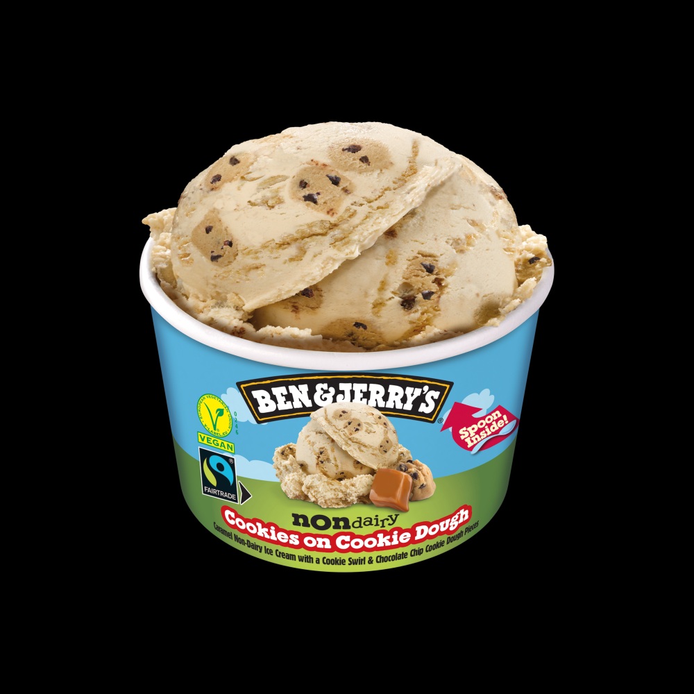 Veganes Karamelleis mit Cookie-Swirls und Choc Chip Cookieteigstückchen.