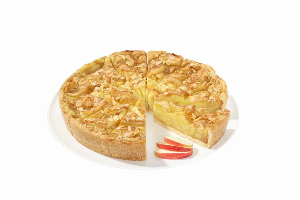 Köstlicher Apfelkuchengenuss! Auf einem leckeren Mürbeteig ohne Milch und Eier liegt eine saftige Apfelfüllung, abgerundet mit Apfelspalten und Mandelblättchen.