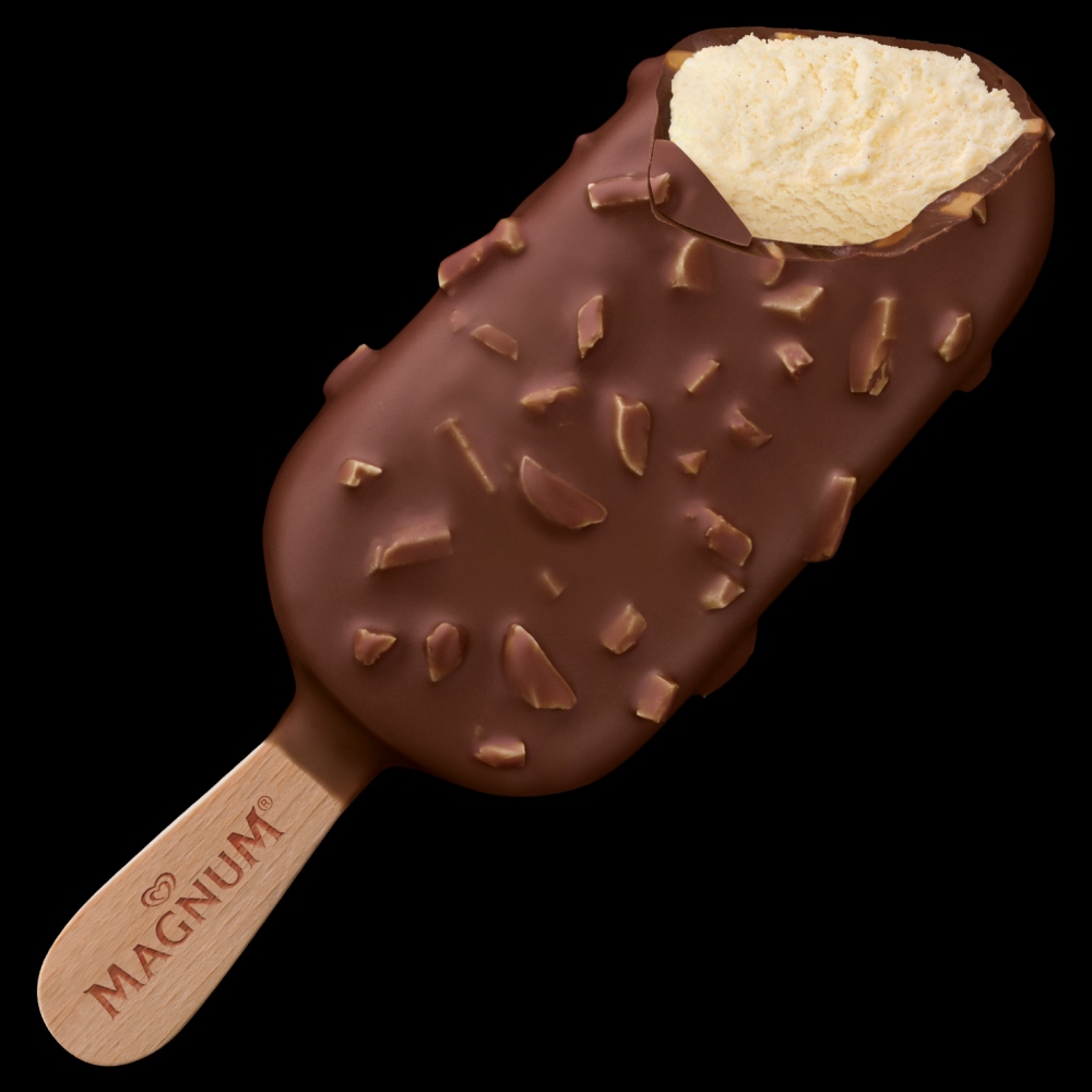 Veganes Vanillespeiseeis, umhüllt von veganer Schokoladenkuvertüre mit Mandelstiften.
