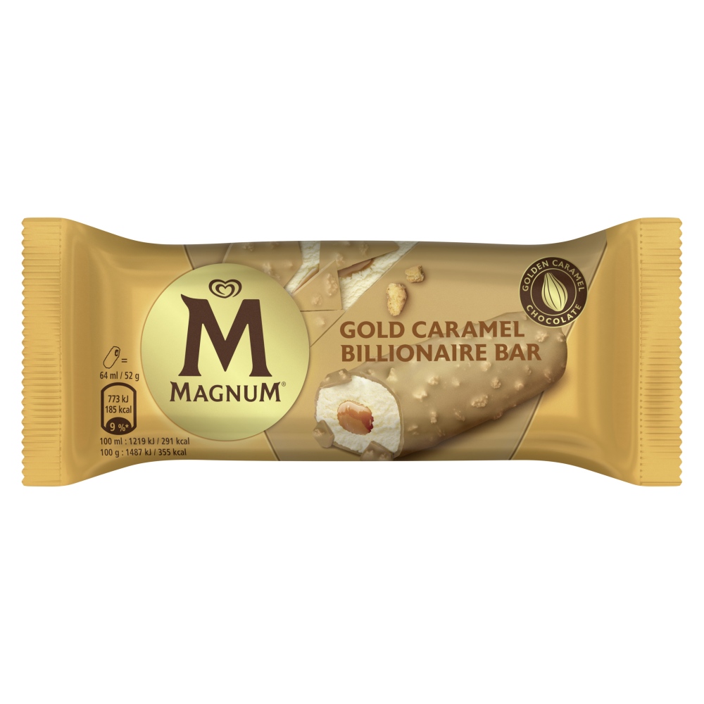 Cremiges Eis mit Keksgeschmack, durchzogen von einem Kern aus Karamellsauce, umhüllt von weißer Schokolade mit Karamell und Kekstückchen.