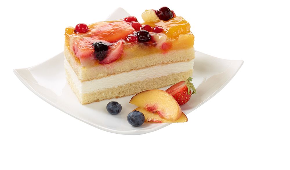 Ein Hingucker in jeder Vitrine. Üppig belegt mit Pfirsich- und Mandarinenfilets, Ananasstücken, Erdbeerhälften, Heidelbeeren und roten Johannisbeeren. Darunter liegt die leckere Frischkäse-Sahne zwischen zwei lockeren Rührteigböden.
