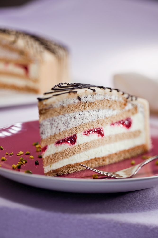 Diese exquisite Tortenkreation entführt Sie in eine neue Geschmackswelt: köstliche Pistazien- undMohnsahne, dazwischen eine Himbeerzubereitung auf schmackhaften Nuss-Tortenböden.Die Torte ist mit Marzipan umhüllt und mit einer kakaohaltigen Fettglasur aufwendig dekoriert.