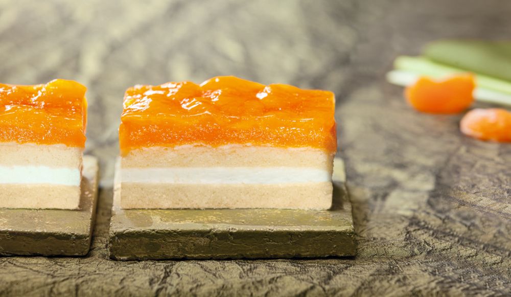 Zwei helle Tortenböden, gefüllt mit feiner Vanillesahne. Darauf liegt eine üppige Schicht aus saftiger Mandarinenfruchtfüllung, Mandarinenspalten und Gelee.