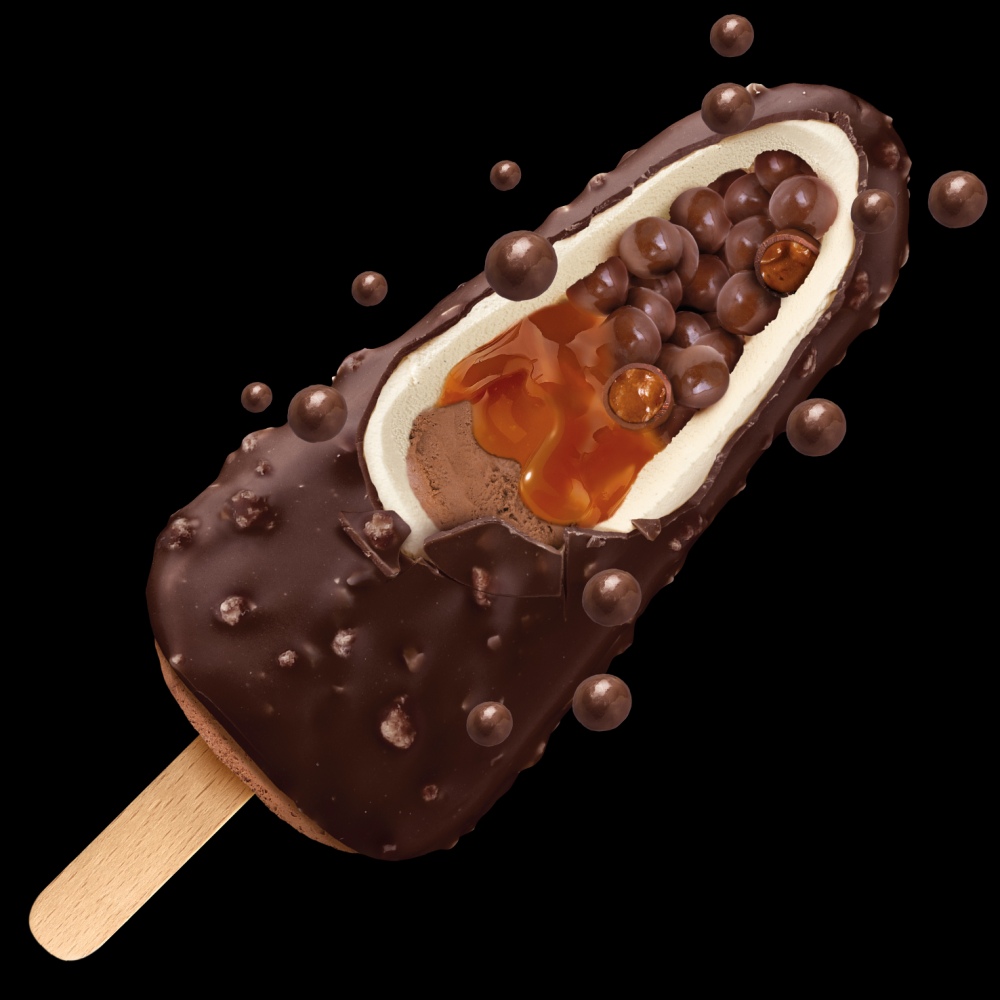 Das erste Multi-Layer-Eis mit 5 Schichten:1. knackige Schokoschicht mit Keks-Stückchen2. cremiges Vanilleeis3. Schokoladenüberzogene Karamellkugeln4. gesalzene Karamellsauce5. Schokoladeneis