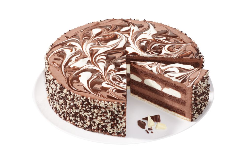 Auf einem Mürbeteigboden liegen zwischen drei dunklen Rührteigböden köstliche helle Sahne und Kakao-Sahne, attraktiv geschichtet. Die edle, marmorierte Garnierung macht den Genuss perfekt!