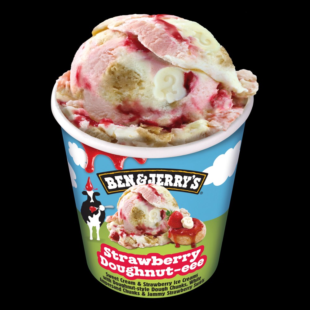 Eis u.Erdbeerfrucht Eis m.Teigstückchen m. Doughnut Geschmack u.Fettglasurstückchen,Erdbeersauce